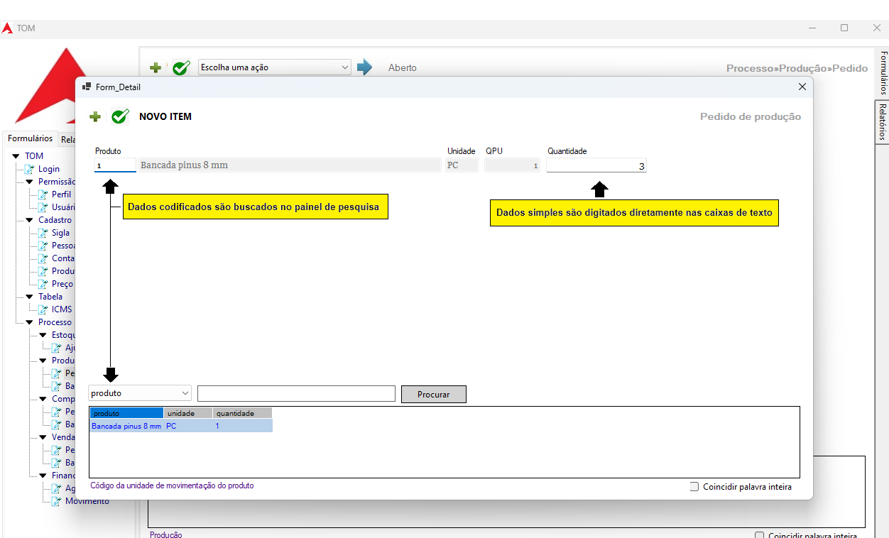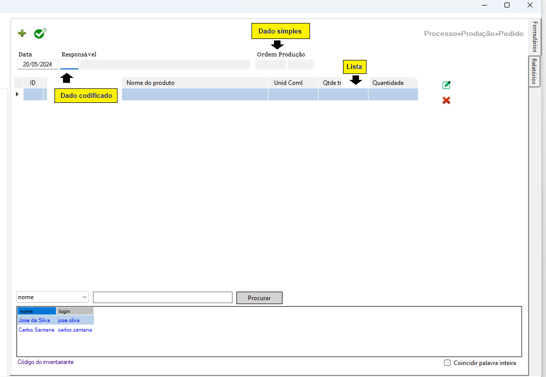Os formulários contemplam três tipos de dados: os dados simples, cujo conteúdo é digitado em caixas de textos, dados codificados com conteúdos identificados por códigos buscados no painel de pesquisa e listas, atualizadas pelo formulário de edição de listas.