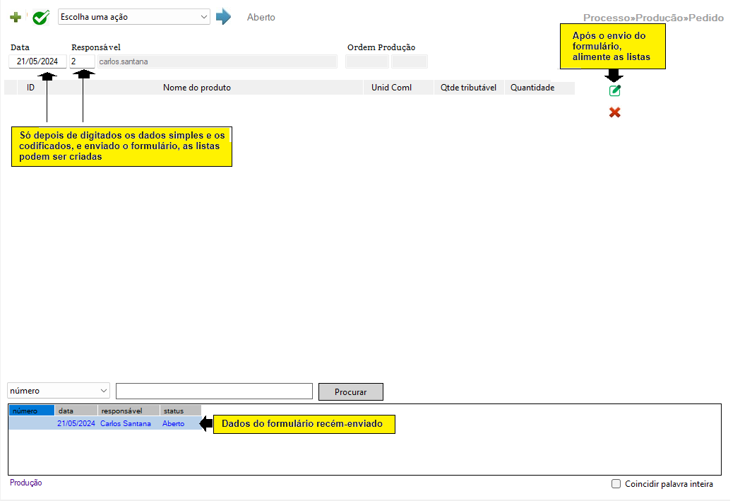 As listas só podem ser criadas em formulários já enviados. Nos formulários novos, são digitados primeiro os dados simples e codificados e, por último, após o envio do formulário, o formulário de edição