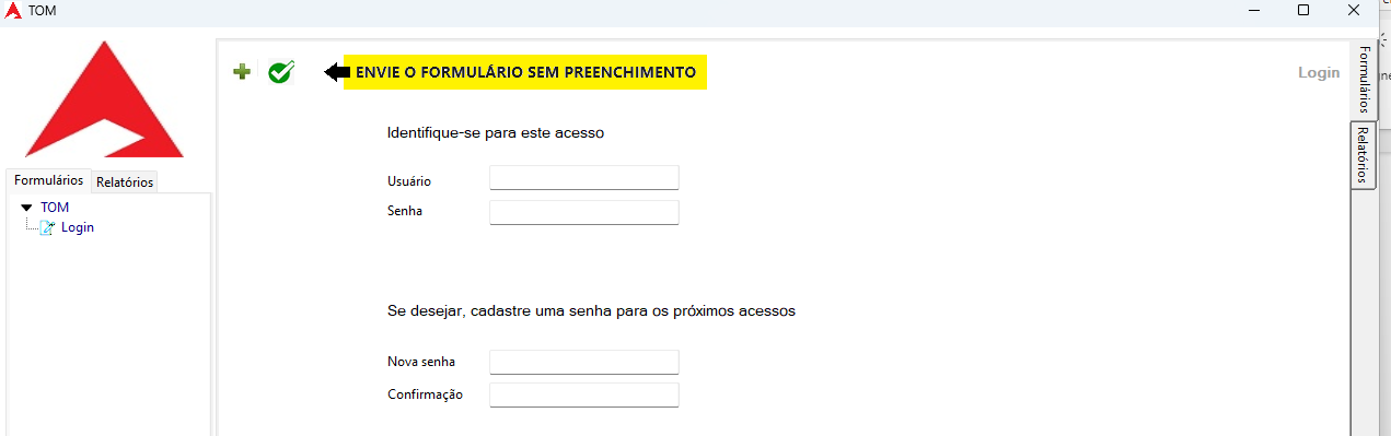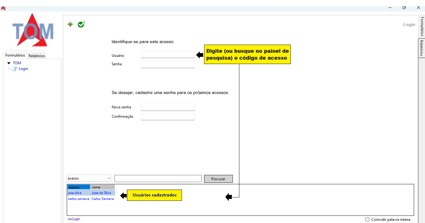Depois de cadastrado pelo menos um usuário , o login é feito digitando-se ou buscando-se no painel de pesquisa o código de acesso.
